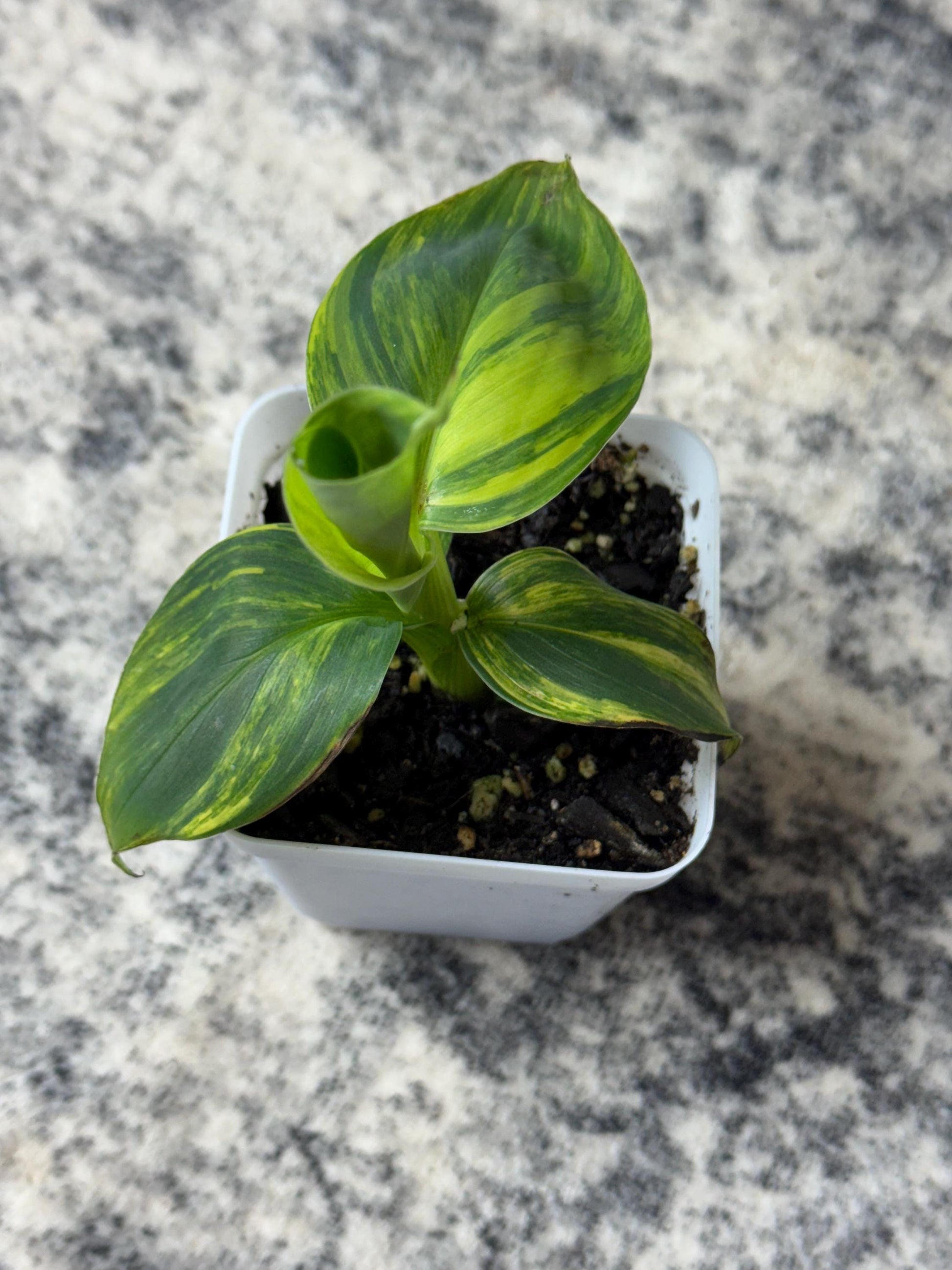 An EXTREMELY rare, eye-catching variegated banana with bold yellow, lime, and deep green striping. Each plant develops its own unique patterning—ranging from marbling and streaking to broader sectoral bands. New leaves may emerge more vivid and show stronger variegation as they mature.
